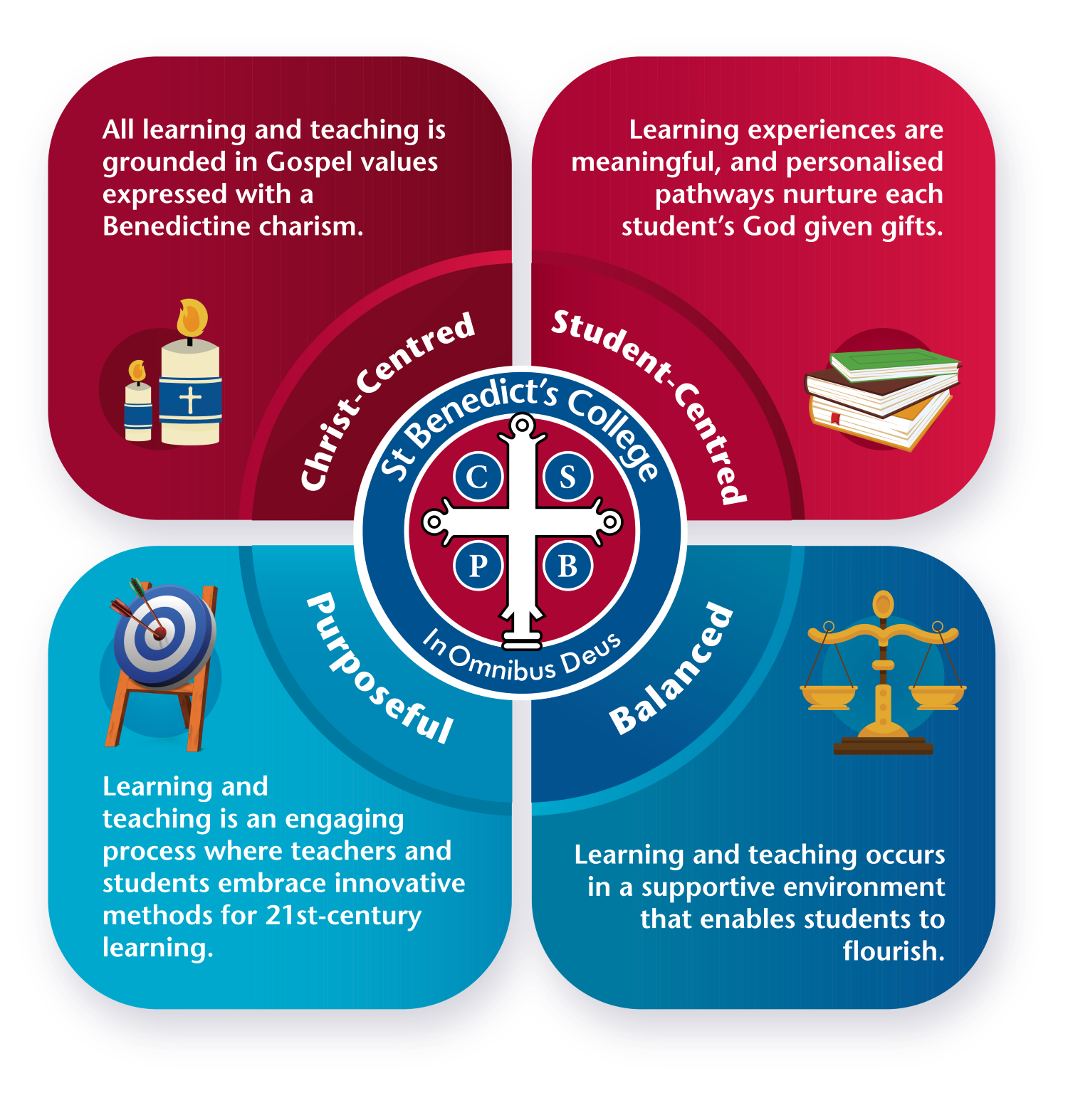 The St Benedict’s College Learning and Teaching Framework establishes a shared understanding of how learning and teaching are approached within our community. It brings together the key elements that define and shape the learning culture of our College, guiding the planning, delivery, and evaluation of high quality education for all students. The framework is intentionally named with "learning" first, reflecting our commitment to placing learners at the heart of everything we do. Rather than prescribing specific methods or techniques, the framework embraces a holistic perspective on the dynamic processes of learning and teaching at St Benedict’s College. Grounded in our College’s Vision, Mission, and Values, the framework is further enriched by contemporary research on effective learning practices. It aligns with the Brisbane Catholic Education Strategy and the principles outlined in the Alice Springs Education Declaration (Mparntwe).